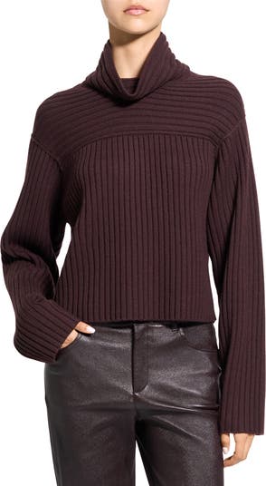 A draped neckline is balanced by the boxy fit of a ribbed sweater knit from merino wool for lightweight warmth.
