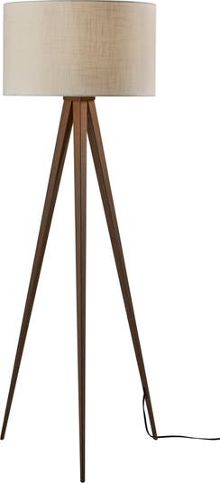 Woodgrain tripod legs add an angular counterpoint to this lamp that brings a contemporary accent to your living room or bedroom.