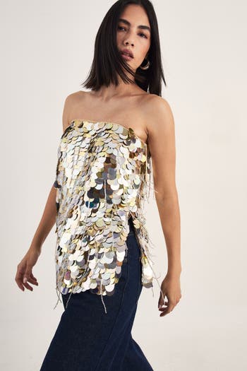 Command attention in this spectacular Disc Tassel Longline Bandeau Top from NastyGal's Icons collection. The striking sequin fabric creates a mesmerising visual effect as you move, whilst the tassel detailing adds dynamic texture and movement to your look.