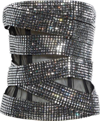 Newly appointed Creative Director Nicholas Aburn continues in the brand's glamorous tradition with this strapless top, where scores of glittering crystals criscross sultry sheer mesh, lighting up your night like a disco ball.