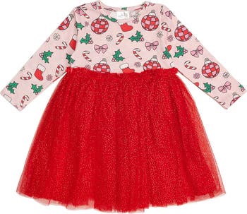 - Features: Disco Christmas printed blush cotton bodice with a red tulle skirt overlay accented with gold glitter pin dots.