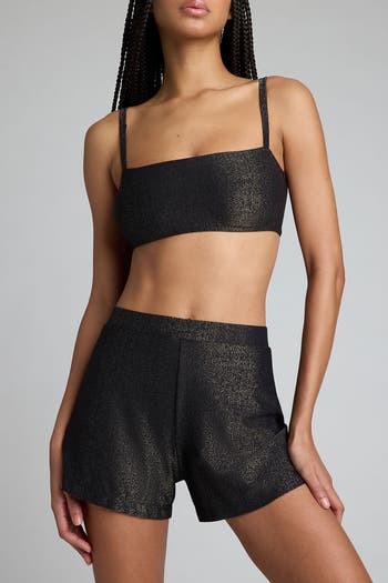 Retro vibes. Glittery, flattering, and relaxed. Our twinkly metallic fabric in a drapey, statement-making short.