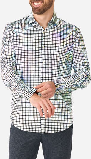 Reflective squares make it irresistible to twirl all night in this paparazzi-ready shirt that's inspired by disco balls and designed to keep you in the spotlight. The lower hem stays tucked if you want it to, but letting it all hang out is the best way to have fun at any party.