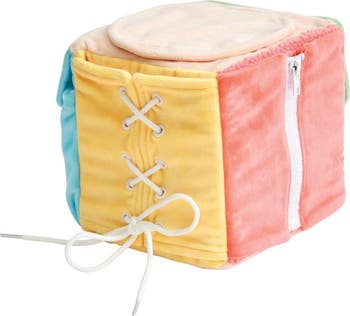 18 months & up. Each side of this cube features another way for toddlers to learn through play! Different colors, fine motor activities, sensory experiences that provide visual, tactile and auditory stimulation, and activities that promote focus, patience and more are all packed into this compact cube. Soft, easy-to-clean fabric and durable add-ons make this perfect for children.