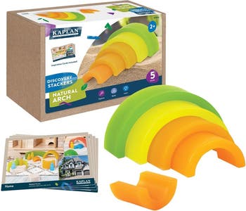 2 years & up. An upgrade from the classic nesting toy, the extremely resilient and durable pieces in the Discovery Stackers - Natural Arch set enhance open-ended play indoors and outdoors. The curved shapes encourage children to explore relationships in balance and organic geometry. With a gradated, nature-inspired color scheme this arched set bridges the gaps between various play patterns and brings a new life to light play. Sets include 5 solid, arched pieces and double-sided inspiration cards complete with ideas for play, relevant vocabulary, and beautiful imagery. The largest arch measures 8.1"L x 2.8"W x 3.9 "H.