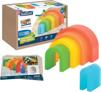 2 years & up. An upgrade from the classic nesting toy, the extremely resilient and durable pieces in the Discovery Stackers - Rainbow Tall Arch set enhance open-ended play indoors and outdoors. The heightened arch shapes encourage children to explore relationships in balance and organic geometry. With vibrant rainbow colors, this arched set bridges the gaps between various play patterns and brings a new life to light play. Sets include 5 solid, arched pieces and double-sided inspiration cards complete with ideas for play, relevant vocabulary, and beautiful imagery. The tallest arch measures 6.9"L x 2.8"W x 5.3"H.