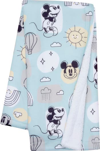 Take Classic Mickey Mouse along wherever you go with this soft and cozy blanket. The front is a pretty sky-blue fleece with a sketch styled Mickey along with rainbows, clouds, suns, and stars. The back of the blanket is an oh so soft furry white faux shearling. It is perfectly sized at 30” X 40”. This blanket makes a great baby shower gift or welcome home baby gift.
