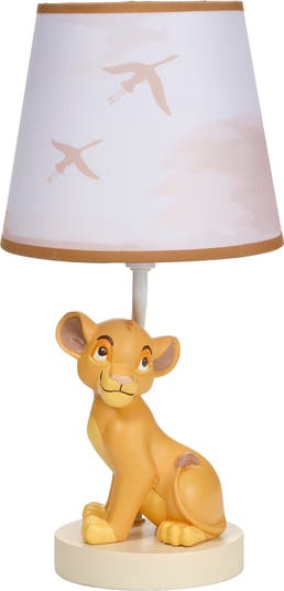 This Lion King Safari custom hand-painted lamp features Disney’s Simba sculpted in 3-dimensional resin sitting in his favorite pose. His body is hand-painted in golden apricot. The lamp shade shows a vanilla sky with a gradation of colors along with a pair of soaring cranes. The total height of the lamp with shade is 14 inches. It will surely add a soft glow to your child’s room. Requires a standard light bulb, not included.