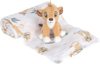 Wrap your little one in total comfort with this white, tan, green, and gray breathable 100% cotton muslin swaddle blanket. It features Lion King along with various plants and leaves on a soft white ground. This set also includes a cute little Lion King plush made in a soft velour. He is approximately 4 ½” tall. His face is embroidered making him baby safe. This set makes a great baby shower gift or welcome home baby gift.