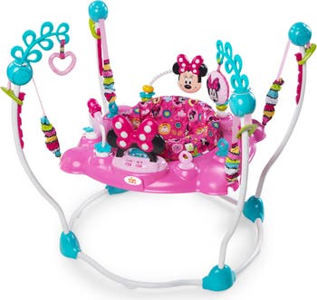 Surprise your baby with peek-a-boo playtime fun that will have her laughing for hours in the Minnie Mouse Peek A Boo Jumper. That sweet giggle is music to Minnies ears (and yours too). Engage your little one with 10 Minnie-themed toys and activities. Lights and sounds will make your baby grin and giggle - the more she jumps, the more music and lights! The jumper seat rotates around and around so baby can easily access all of the toys and activities. Easily control volume for quieter play and height adjustment for lasting entertainment. This activity jumper features four height positions to make sure those little feet can bounce from the right height every time. 3 link loops and a built-in toy tray allow you to add even more of babys favorite toys. Made for babies 6 months to 1 year or up to 25lbs and 30 tall, with balls of feet able to safely and securely touch the floor. Easy to clean seat pad and wipeable frame and toys. Power the fun with 2 AA batteries (not included). From the
