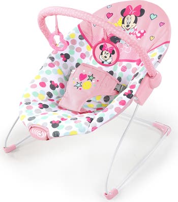 Disney Baby and Bright Starts present the magic of Minnie Mouses Spotty Dotty Vibrating Bouncer. This light pink and polka-dotted baby bouncer combines Minnies favorite things: fashion and fun! Made with extra-plush fabric and soothing motions, the bouncy seat holds your baby girl like a hug from Minnie herself. Two cute Minnie-themed toys hang above for reaching, grabbing, batting and playing. The non-slip feet and a 3-point harness make sure your little one stays safe and secure. A bit of Minnies magic means you can set up this vibrating bouncer with no assembly and remove the toy bar with just one hand!