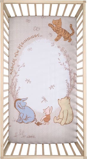 The breathable 100% cotton photo opportunity Classic Pooh fitted crib sheet is the perfect way to capture a memorable moment with your little one. Your baby will be surrounded by Pooh, Piglet, Eeyore, and Tigger along with the words Magical new beginnings. There is elastic all the way around ensuring a safe and secure fit on a standard-size crib mattress. This sheet will create a calming and inviting sleep space for your little one.