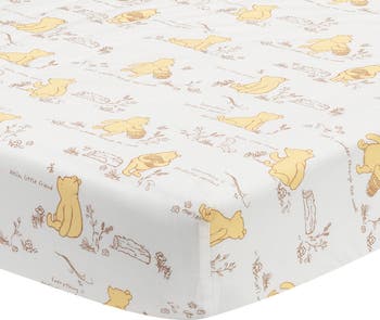 This breathable 100% cotton fitted crib sheet features Classic Pooh in a variety of poses. Winnie the Pooh is holding his favorite honey pot, interacting with a squirrel and a dragonfly, and wandering through the woods. The crib sheet has elastic all the way around ensuring a safe and secure fit on a standard-sized crib mattress measuring 28” X 52”.