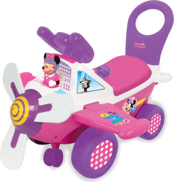 Hear Minnie play her favorite music with flashing colorful lights! see propellers rotate to changing light-up patterns as you drive around. Press to hear realistic lift-off & landing sounds. Steer wheel and honk horn for great driving fun. Plane can make full 360˚ turns as you steer around.