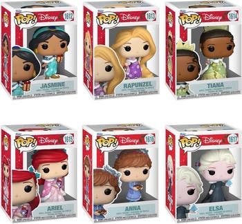 Disney Princess Holiday 2025 Funko Pop! Complete Set (6). Includes Ariel, Jasmine, Rapunzel, Tiana, Anna, and Elsa. Each comes individually packaged in a Funko Pop! window display box.