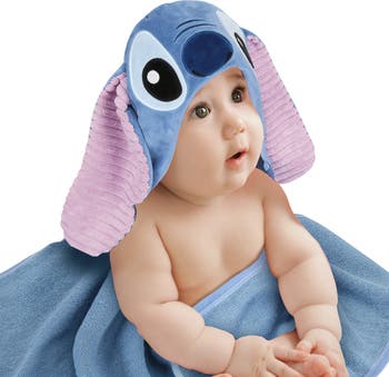 Your little one will love being wrapped in this soft and cozy Disney Stitch hooded towel. The hood is velour and is lined in a medium blue 100% cotton terrycloth. The pure cotton terry towel is absorbent, and the binding is made of cotton jersey. The hood of the towel features Stitch with his 9” long 3-dimensional ears. The hooded towel is 34” wide and 23” high and is recommended for babies up to 30 pounds. This makes an adorable baby shower gift or welcome home baby gift.