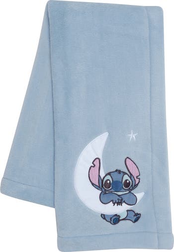 This ocean blue soft fleece baby blanket will keep your little one warm and cozy. Disney's Stitch, with his mischievous charm, is on a white crescent velour moon and next to an embroidered white star. Stitch is made in a soft minky blue, his nose is velour, and his ears are appliqued in textured corduroy. This makes a great stroller blanket at 30 inches by 40 inches. Perfect for running errands, going to the park and for moms, dads, and babies on the go.