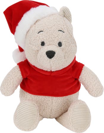 Bring home the magic of the holidays with our Winnie the Pooh Christmas themed Plush stuffed animal toy. Disney's Classic Pooh loves wearing his red velour Santa hat with furry white trim along with his favorite red velour shirt. He is made in a creamy beige textured boucle. His inner ears, bottom of his feet, and the back of his hands are a beige colored ribbed velour. Pooh’s eyes, brows, nose, and mouth are embroidered in charcoal grey. He is ready to spread holiday cheer.