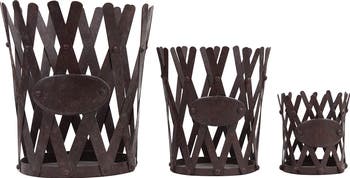 The sides on these planters are designed after an accordion style gate. There are large openings throughout for full view of its contents. Fill each with a potted plant or other items. If wanting to vary their uses, place a small plastic bag in the large and use for a garbage can while placing pillar candles in the two smaller ones.