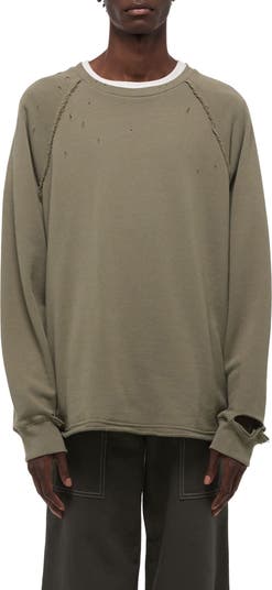 Built to look broken in from day one, this all-cotton sweatshirt stacks strategic rips, grind at the seams and easy raglan-sleeve construction to land that loose, grungy slouch without giving up structure.