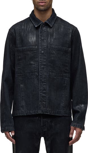 Dark cotton denim that's faded, scraped and streaked with paint brings instant history to a worker jacket made with roomy exterior pockets and covered snaps on the front and cuffs. Wear it over something lightweight when the weather is cool or layer it over something more substantial when the temperatures start to plummet.