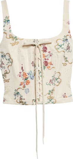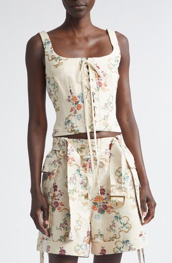 This creamy boned corset top shown on the spring '26 runway is crafted from a delicate floral jacquard distressed with rips and fraying for signature McQueen edge.