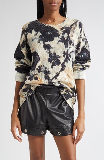 For prefall '25, Chris Leba stays true to his roots with punked-up flora he deems 'pretty but a little dark.' Take, for example, the moody bouquet haphazardly scattered on this slouchy cotton sweater given the New York designer's typical '90s-grunge treatment via threadbare rips and gnarled edges.