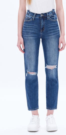 Cropped, straight-leg jeans get vintage-inspired style from threadbare knees and low-stretch denim that takes on character with wear.