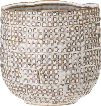 Distressed Stoneware Planter with Embossed Woven Design, White