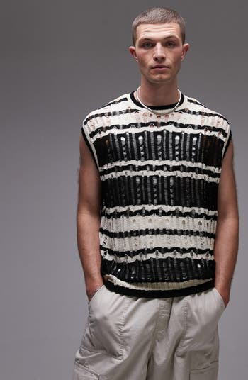Knit in horizontal stripes and distressed in threadbare verticals, this sweater-vest features a slightly slouchy fit that complements its completely casual look. Wear it on its own to show some skin and enjoy some ventilation or layer it over something soft if you're feeling modest.
