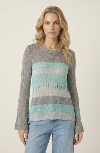 A lightweight striped knit sweater with distressed detailing and flared sleeves brings an effortlessly cool finish to your everyday wardrobe.
