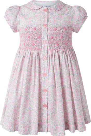 Introducing the Ditsy Bloom Smocked Button-front Dress, a pretty and elegant girls' dress perfect for any special occasion. The smocked panel across the front bodice adds extra flair, while the sweet floral print in pastel hues creates a charming look. Elevate your little one's style with this must-have dress.