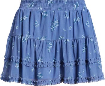 Tiered ruffles and a ditsy floral print give this twirly mesh miniskort a playful look, while a smocked elastic waist lends an easy, comfortable fit.