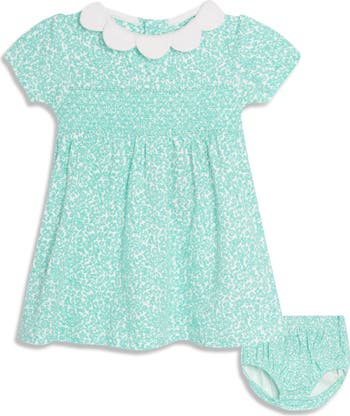 A scalloped collar and smocked detail bring timeless touches to this floral-print cotton dress complete with matching bloomers to give baby a polished look.