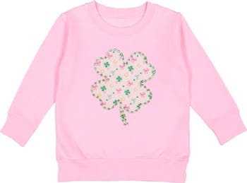 This darling pink sweatshirt features a large, charming four-leaf clover patch filled with a playful pattern of tiny shamrocks, pink bows, and golden horseshoes, making it the sweetest look for St. Patrick's Day fun!