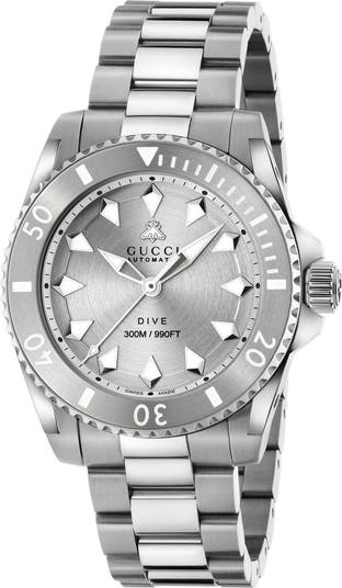 This sporty diving watch that can handle depths of up to 300 meters is marked with luminous, easy-to-read hands and features a unidirectional rotating bezel. The sapphire crystal face is both antireflective and scratch resistant, making this watch a rugged and sophisticated accent to your wardrobe.
