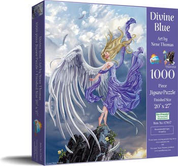Experience a captivating realm of beauty and wonder with the Divine Blue 1000 piece jigsaw puzzle for adults. Crafted by esteemed artist Nene Thomas, the puzzle portrays an enchanting fantasy scene, promising not only a gratifying challenge but also an exquisite piece of art, perfect for display. Manufactured by SunsOut Puzzles in the USA, the Divine Blue puzzle epitomizes superior quality craftsmanship, with each piece precisely crafted for perfect interlocking. Celebrate sustainability without compromising on your puzzle-solving hobby, as SunsOut commits to eco-friendly practices by utilizing soy-based inks and high-quality recycled cardboard. Offering hours of leisure and a chance to hone your creativity, this jigsaw puzzle serves as an ideal gift for puzzle enthusiasts and novices alike. Sourced from a woman-owned small business, selecting SunsOut Puzzles supports American craftsmanship and bolsters small ventures devoted to delivering premium products. When completed, the Divine Blue puzzle becomes a distinctive piece of art that can be treasured, gifted, and appreciated. It's not just about completing a puzzle; it's about experiencing the satisfaction of connecting fantasy and craftsmanship.