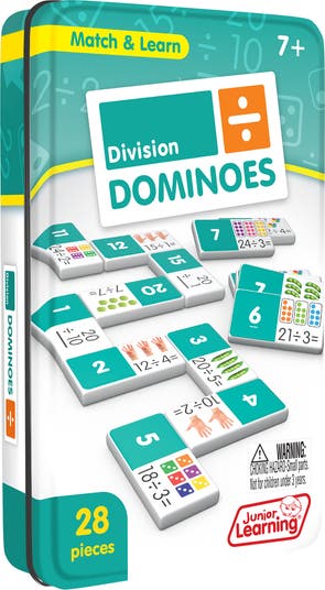 Match and Learn Math with Junior Learning Division dominoes are a great learning resource and an excellent manipulative for reinforcing key concepts. It includes 28 piece of melamine dominoes. The dominoes come in a collectors tin for storage and the game guide can be found on the back of it. A perfect addition to your classroom or home learning resources. Children will love and enjoy the feel of real dominoes as they complete the division matching game. Dominoes measures 1.9 x 1 x 0.25 inches. For ages 7 - 12. Grade 2 - Grade 6. WARNING: CHOKING HAZARD-Small parts. Not for children under 3 years.