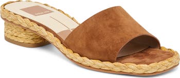 A raffia-wrapped midsole and heel create a boho aesthetic on a minimalist slide sandal designed with a supple suede upper.