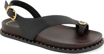 A gleaming toe loop and asymmetric strap shape the contemporary silhouette of this resort-ready sandal trimmed with a studded welt.