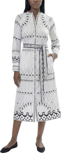 Designed with effortless structure and everyday elegance, the Area Stars Diya Dress offers a fresh take on the classic shirtdress silhouette. Crafted from a soft woven fabric, this long-sleeve style features a clean mandarin collar and a full button-front closure for timeless appeal. A self-tie belt cinches the waist for a flattering shape, while side pockets add functional ease. Finished with a midi length and an allover graphic print, this versatile dress transitions seamlessly from casual daytime wear to polished occasions. SIZE & FIT• True-to-size fit• Non-stretch woven construction• Midi length; designed to fall at mid-calf • Imported