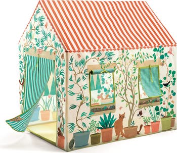 Greenery and darling critters mark the outside of a playful pop-up house crafted from durable fabric and plastic pipes that make it easy to fold and transport.