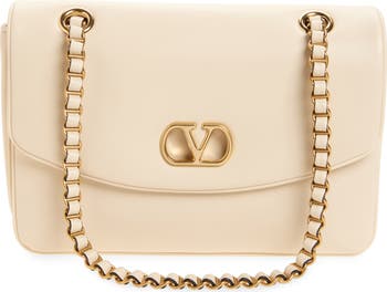This supple leather bag is fronted with a golden VLOGO and can be worn on the shoulder or crossbody thanks to the sliding leather-threaded chain strap. The zip-top compartment in front is great for easy access to often-used essentials, while the larger compartment in back holds larger items.