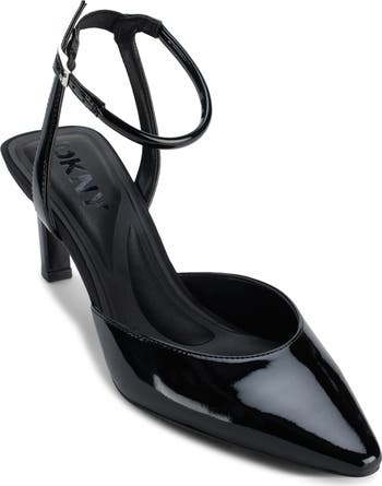 A pointy toe and tapered heel balance a sleek leather pump fashioned with an adjustable ankle strap for a secure fit.