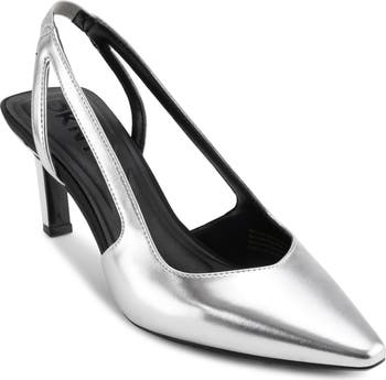 Sleek side cutouts create visual intrigue on a slingback pump balanced by a pointy toe and tapered heel.
