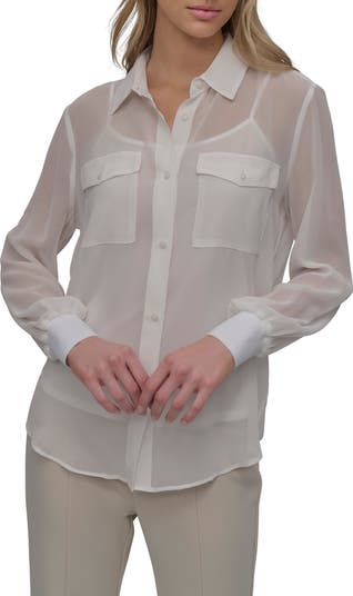 Cut from airy chiffon, this longline shirt comes with a slinky cami for a semi-sheer effect. A curved shirttail hem allows for easy tucking and graceful movement.