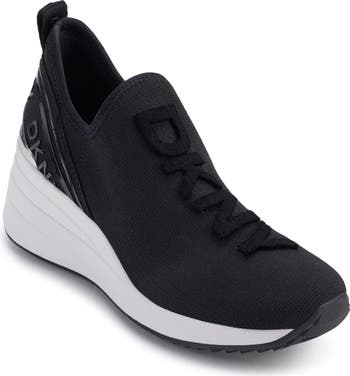 Tonal logo details add a touch of signature sophistication to a sporty knit sneaker lifted by a contrasting wedge heel.