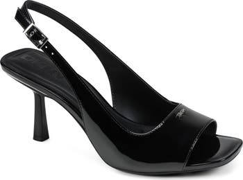 Step out in modern elegance with this slingback sandal topped by polished logo hardware.