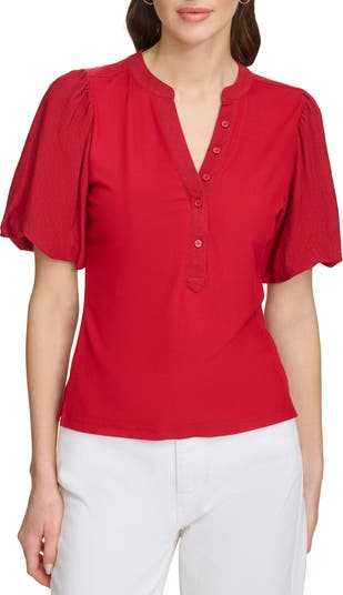 Billowy crinkled puff sleeves frame a henley-style top articulated by slim ribbing all over the bodice.