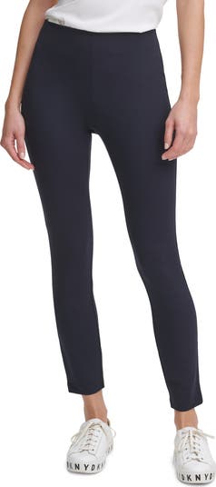 Contrasting fabrics bring sleek appeal to these shapely high-waist legging finished with an ankle-grazing hem.